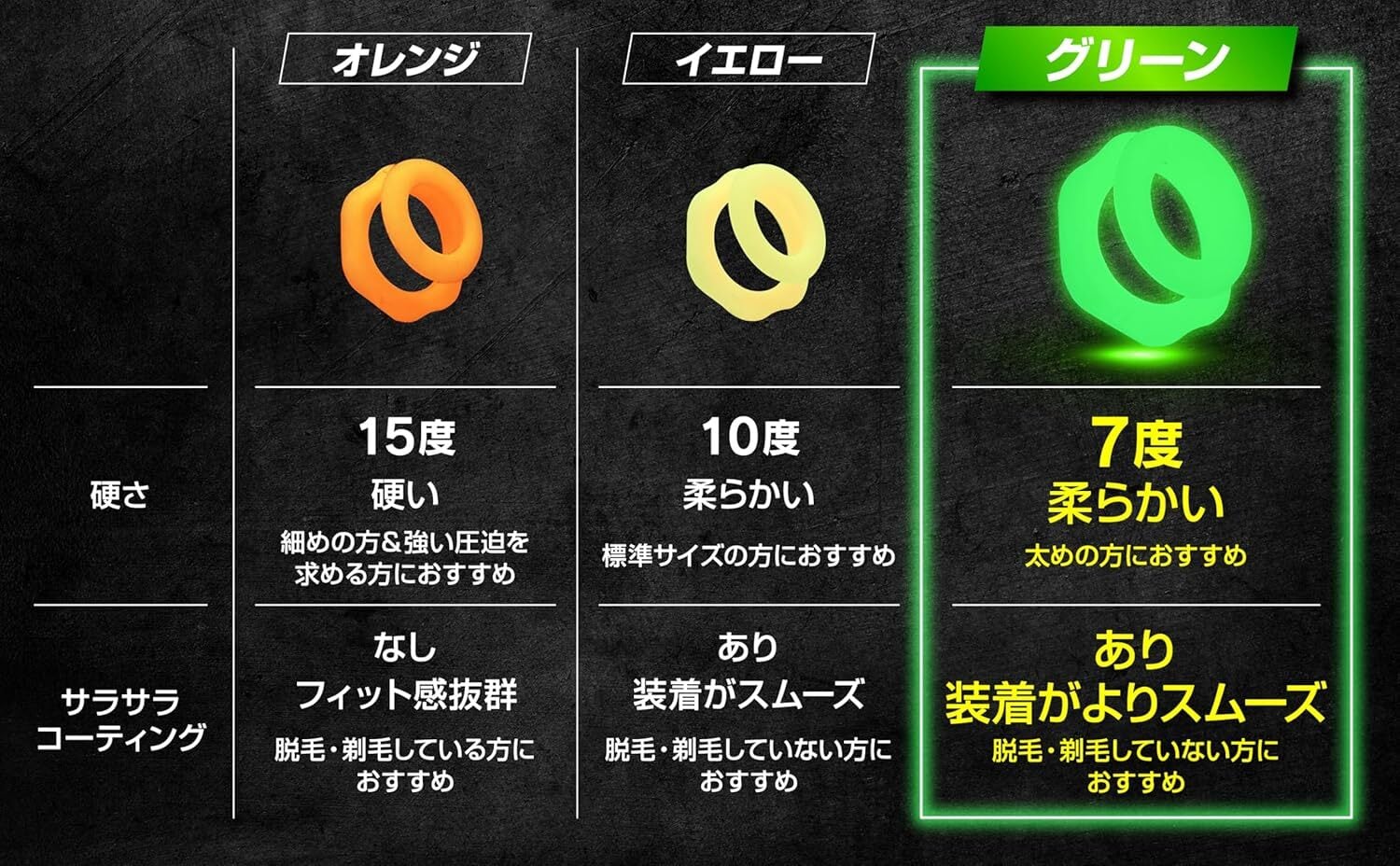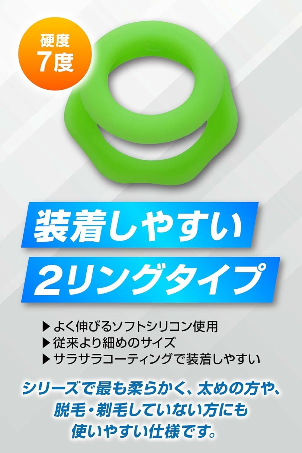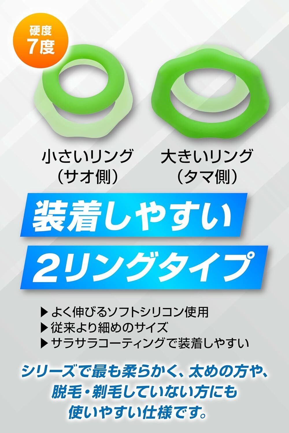 柔軟性に優れたシリコーン素材を使用しているため、装着時の快適さは抜群です。手軽に水洗いができ、繰り返し使用できるのも嬉しいポイント。グリーンのカラーが魅力的で、シンプルながらも存在感があります。硬さは7度で、しっかりとしたフィット感を実現。