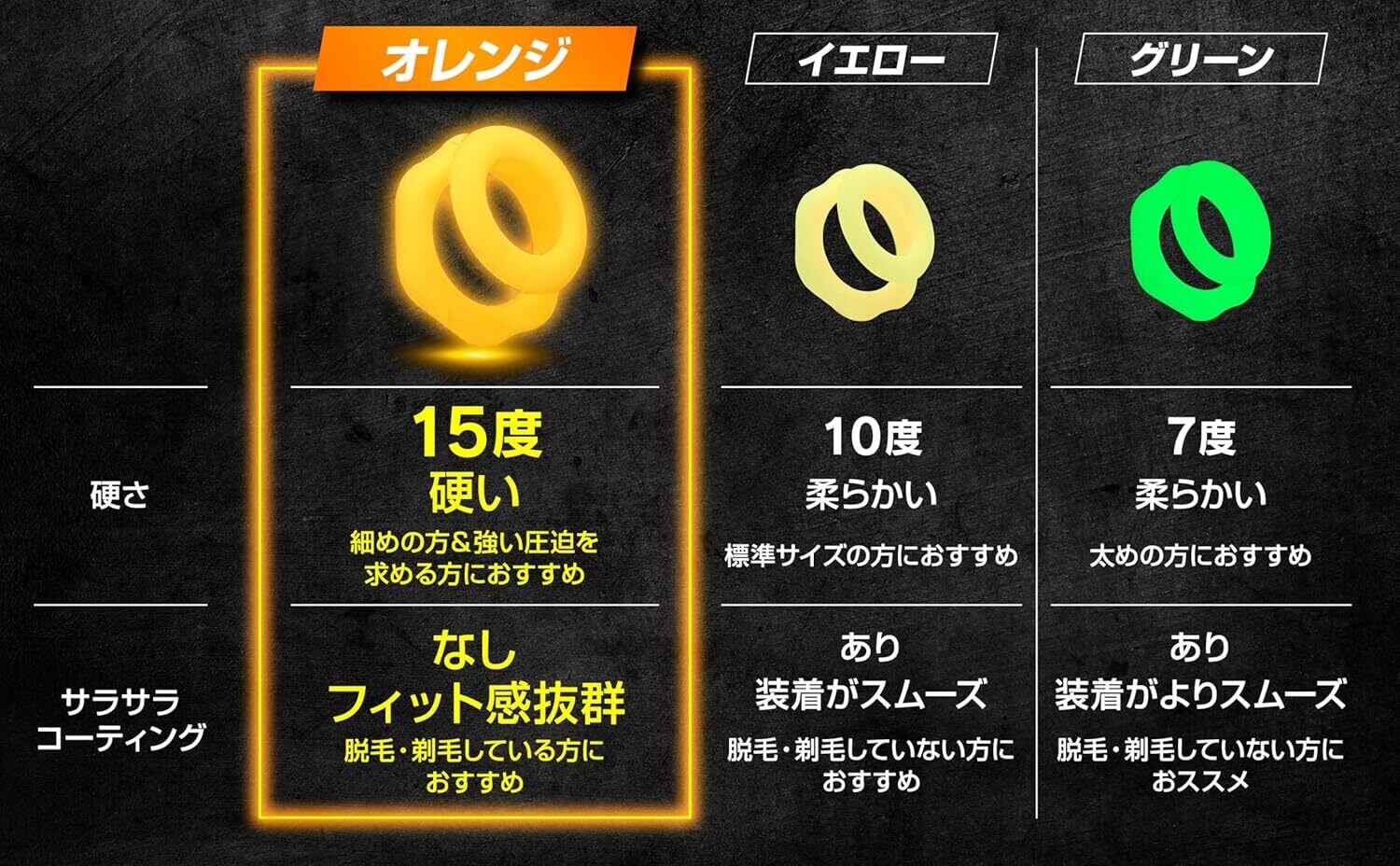 柔軟性に優れたシリコーン素材を使用しているので、装着感はとても快適です。手軽に水洗いができ、繰り返し使えるのも大きな魅力。鮮やかなオレンジカラーが目を引き、シンプルながらも存在感を放ちます。硬さは15度で、しっかりとしたフィット感を実現しています。